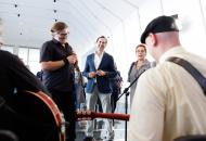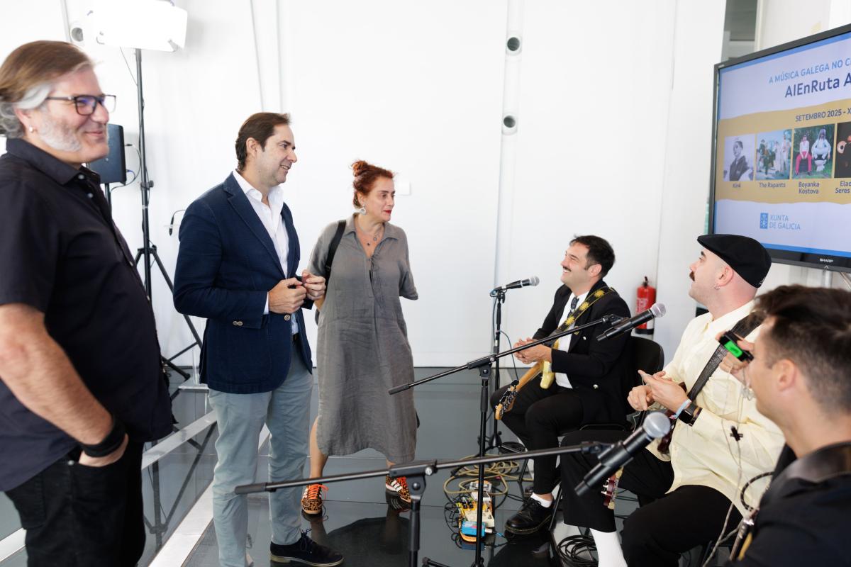 Una treintena de representantes del sector asistieron hoy en la Cidade da Cultura de Galicia, en Santiago de Compostela, al anuncio de esta participación gallega en AIEnRUTa con el patrocinio de la Consellería de Cultura, Lingua e Xuventude. El director de la Axencia Galega das Industrias Culturais, Jacobo Sutil, estuvo acompañado en esta presentación por Gema Sánchez Torres, coordinadora del circuito; el músico gallego Xacobe Martínez Antelo, responsable del Fondo Asistencial y Cultural de AIE; Pilar Portela, coordinadora de Música y Danza de la Axencia Galega das Industrias Culturais; y una amplia representación de los grupos gallegos seleccionados. Los muradanos The Rapants fueron los encargados de poner la música, con la interpretación en directo de tres de sus temas más conocidos.