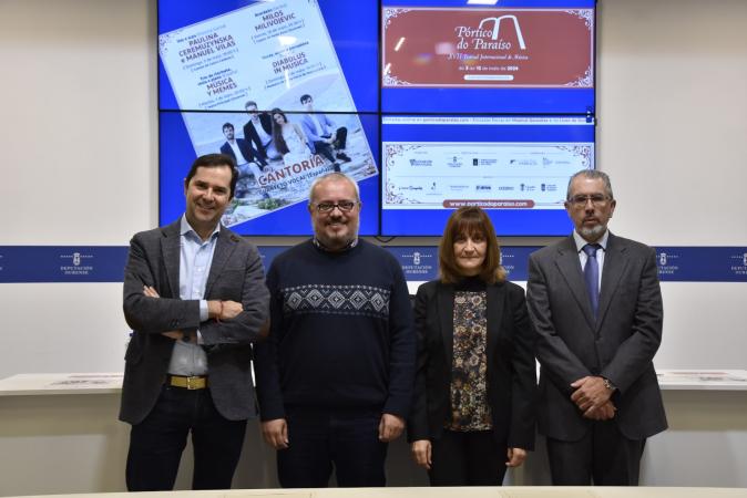 La organización del Festival Internacional de Música Pórtico del Paraíso presentó hoy el cartel de su 17ª edición, que se celebrará del 3 a 12 de mayo en diferentes espacios singulares de los ayuntamientos de Ourense, Castro Caldelas y Cea. La Xunta de Galicia mantiene su colaboración económica con esta iniciativa, dedicada a la difusión de la música culta desde escenarios arquitectónicos patrimoniales, que este año ofrecerá cinco conciertos a cargo de formaciones de Serbia, Francia y España, además del dúo integrado por el arpista gallego Manuel Vilas y la mezzo-soprano polaca Paulina Ceremuzynska.