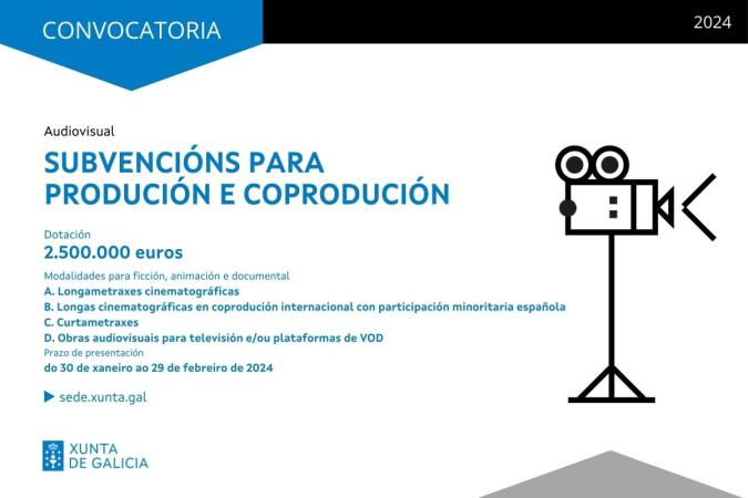 El Diario Oficial de Galicia publica hoy las bases de la convocatoria de subvenciones a proyectos de producción y coproducción audiovisual de 2024, para las que la Xunta consolida una dotación de 2,5 millones de euros como principal línea de inversión directa en el sector.