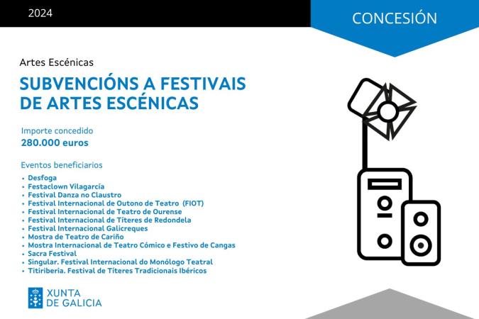 La Xunta de Galicia adjudicó las subvenciones a festivales de artes escénicas, cuya convocatoria había sido abierta el pasado mes de abril con una dotación total de 280.000 euros, lo que supone un incremento del 30,2% @respecto de 2023. Las ayudas benefician este año a 12 proyectos, dos más que en la pasada edición, y consolidan el apoyo creciente de la Axencia Galega das Industrias Culturais la estos encuentros, certámenes y muestras, organizadas de manera profesional y considerados estratégicos para el sector.