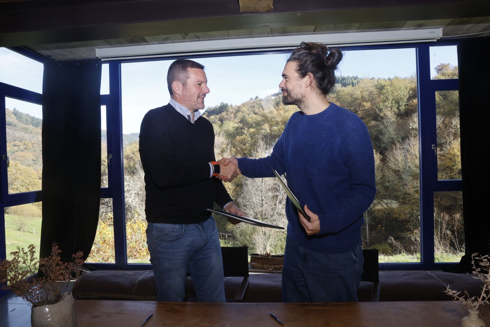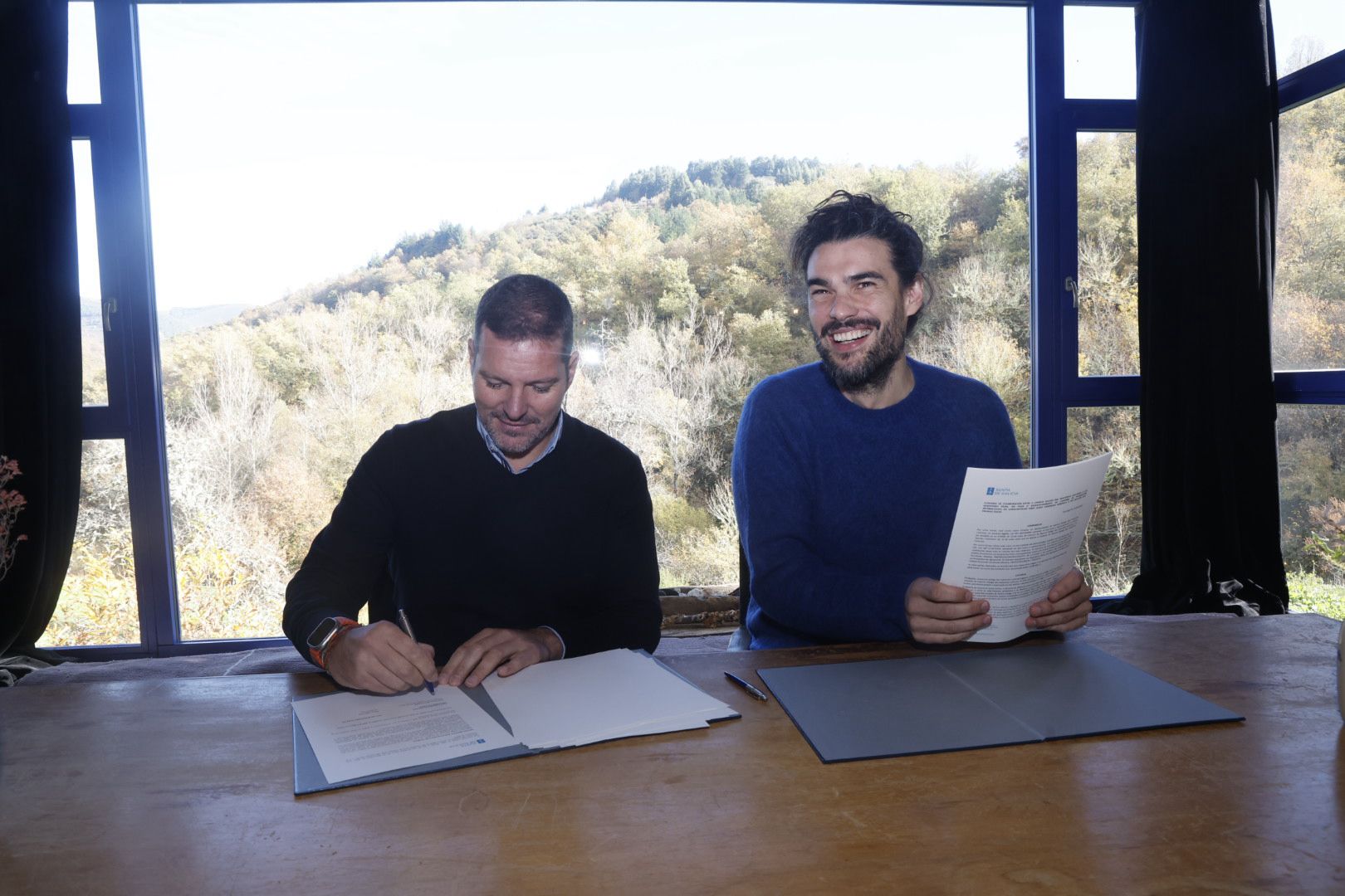 El conselleiro de Cultura, Lingua e Xuventude, José López Campos, y el director de cine Oliver Laxe firmaron hoy en Navia de Suarna el convenio de colaboración a través del que la Xunta de Galicia invierte 50.000 euros en la campaña de promoción internacional de la película Sirat como candidata oficial de España para optar al Oscar a la mejor película internacional.