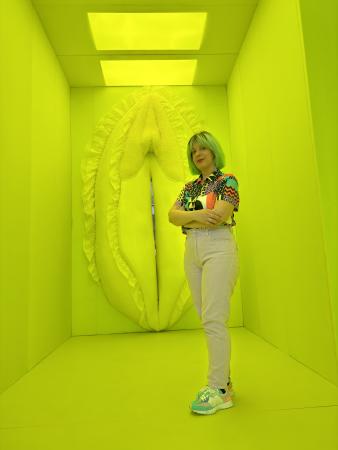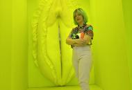 A sala está dominada por unha gran escultura téxtil que sae da parede: unha vulva de tres metros e medio de altura. A peza, realizada en licra, algodón, blonda e madeira, é transitable e funciona como unha porta de entrada que conecta dúas realidades, o aquí e agora e o descoñecido. A instalación combina diversos elementos escultóricos, textuais, visuais e sonoros nos que Marta Pazos reproduce un ambiente de “paseo uterino".