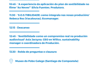 O Museo do Pobo Galego acollerá os tres relatorios deste encontro, que se desenvolverá entre ás 10,30 e as 14,00 h. Serán impartidos por Silvia Fuentes, da produtora Sétima, quen falará da súa propia experiencia na aplicación do plan de sostibilidade durante a rodaxe de As neves; Rebeca Ros, socia fundadora de Vacaloura Consumo Responsable, que ofrecerá diferentes pautas para conseguir unha produción sostible, e Asia Jarzyna, creadora do software Willco App e coordinadora de produción con case 20 anos de experiencia en producións internacionais, cunha intervención titulada Sostibilidade como un compromiso real na produción audiovisual.