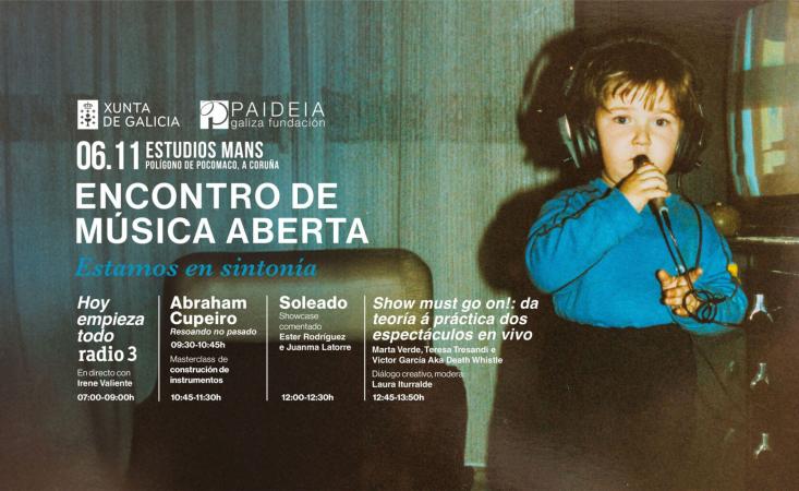 A primeira edición do Encontro de Música Aberta, organizado pola Xunta de Galicia e a Fundación Paideia Galiza, terá lugar o vindeiro martes 6 de novembro na sede dos Estudios Mans, na Coruña, co obxectivo de conectar o sector musical galego con todos os públicos mediante unha xornada centrada na formación, o debate e o networking.