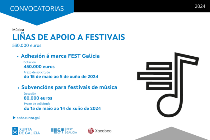 No caso de FEST Galicia, o selo creado polo Goberno galego para agrupar festivais que difunden a imaxe da nosa Comunidade como destino musical baixo criterios de calidade e sustentabilidade, este ano destínanse 450.000 euros a contratos de patrocinio con entidades privadas que organicen encontros destas características entre o 15 de maio e o 30 de setembro. O prazo de solicitude permanecerá aberto ata o 5 de xuño a través da sede electrónica da Xunta de Galicia.