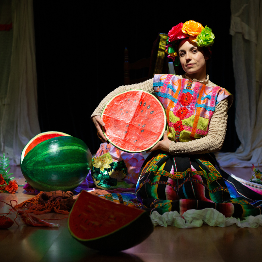 FRIDA é unha peza dirixida ao público familiar onde a través do corpo en movemento, títeres e obxectos poñemos en valor o poder transformador da arte. Reconstruímos cadros vivintes a través da danza e movemento de obxectos, onde a música xoga un papel fundamental. Trátase dun espectáculo poético, colorido e con moita, moita vida. Anxo García é o encargado de deseñar os títeres e seleccionar os obxectos que aparecen na obra. Frida era unha gran contadora de historias e botaba man dun pequeno teatriño de títeres para representalas. Contaremos con títeres tradicionais e con obxectos. Olga Cameselle é a encargada de coreografar as danzas e movementos que nos levan á recreación dos cadros. A música está a cargo do compositor Manuel Paino.