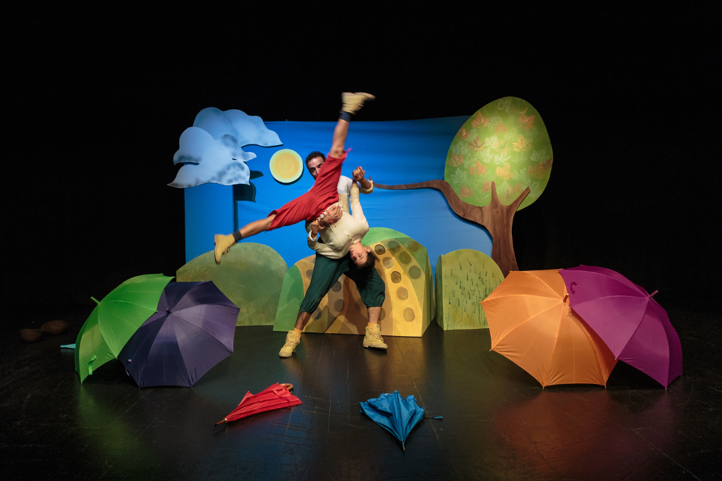 As nubes chegan. Chove. Sae o sol. A natureza esperta para encherse de cores. Ó amparo dos paraugas atoparemos agocho, bailaremos, cantaremos, e acompañados de pintorescos animais seremos parte da mesma paisaxe. Nube nube sol métenos de cheo na diversión e na aprendizaxe de todo o que a choiva e o sol provocan na nosa contorna. A través do corpo, a xestualidade, o canto e a música, Teatro ó cubo achega á primeira infancia a maxia dos ciclos da natureza e a importancia da choiva para que todo medre.